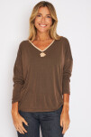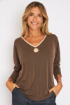 Remera esc v con vivo dorado y prendedor en flor